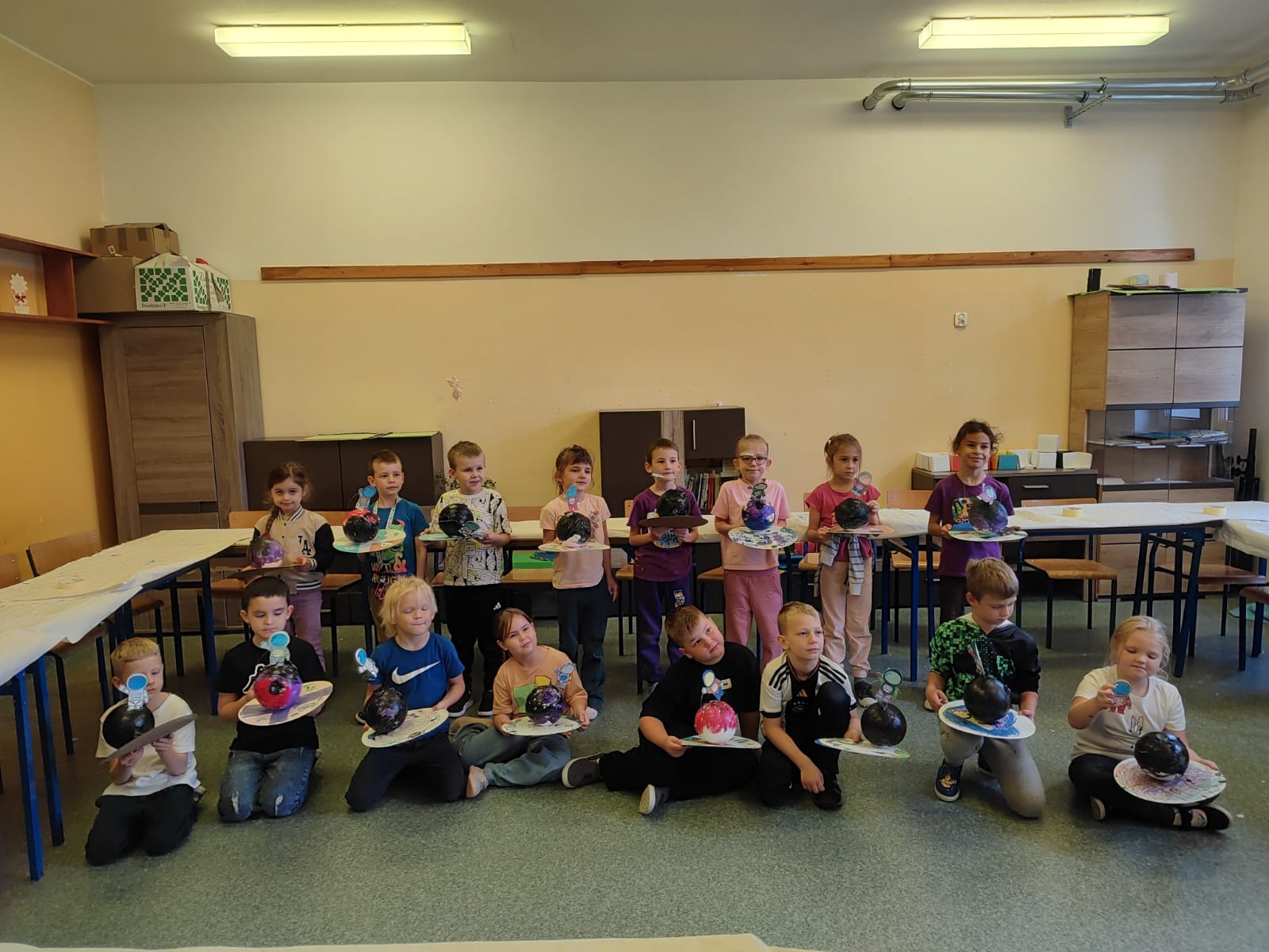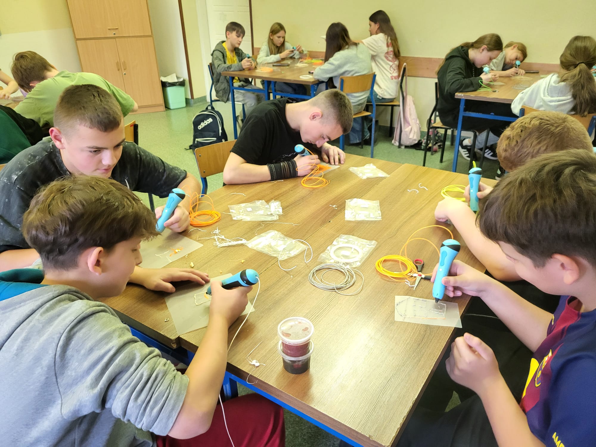 Uczniowie ze wszystkich czterech szkół uczestniczyli w kilkumiesięcznym cyklu intensywnych zajęć pozalekcyjnych, łączących naukę, technologię i twórczą zabawę w duchu STEM. Zajęcia miały charakter praktyczny i doświadczalny. Dzieci tworzyły własne hologramy, projektowały i drukowały modele 3D, budowały kreatywne konstrukcje oraz wykonywały kosmiczne szkatułki, rozwijając zdolności manualne i wyobraźnię przestrzenną. Pracując z efektami UV, poznawały właściwości światła i jego zastosowania w nauce. W ramach działań projektu odbyły się również zajęcia z robotyki, podczas których uczniowie budowali z klocków roboty poruszające się, a następnie programowali ich działanie. Dzieci uczyły się podstaw mechaniki, algorytmicznego myślenia oraz współpracy w zespole, testując swoje konstrukcje i samodzielnie rozwiązywały pojawiające się problemy techniczne. Równolegle uczniowie poznawali sylwetki wybitnych naukowców – astronomów, fizyków i chemików – takich jak Mikołaj Kopernik, Maria Skłodowska-Curie czy Albert Einstein. Zajęcia te pozwalały dzieciom zrozumieć znaczenie odkryć naukowych oraz uświadomić, że nauka to proces oparty na ciekawości, obserwacji i wytrwałości. Dużą dawkę kreatywności przyniosły warsztaty artystyczno-techniczne, podczas których uczniowie projektowali własne torby oraz tworzyli autorskie gry planszowe. Projektowanie zasad, plansz i mechaniki gry było okazją do ćwiczenia logicznego myślenia, planowania oraz pracy zespołowej. Podczas tzw. „kosmicznych pojedynków” dzieci testowały swoje gry, ucząc się zasad fair play, strategicznego myślenia oraz wyciągania wniosków.