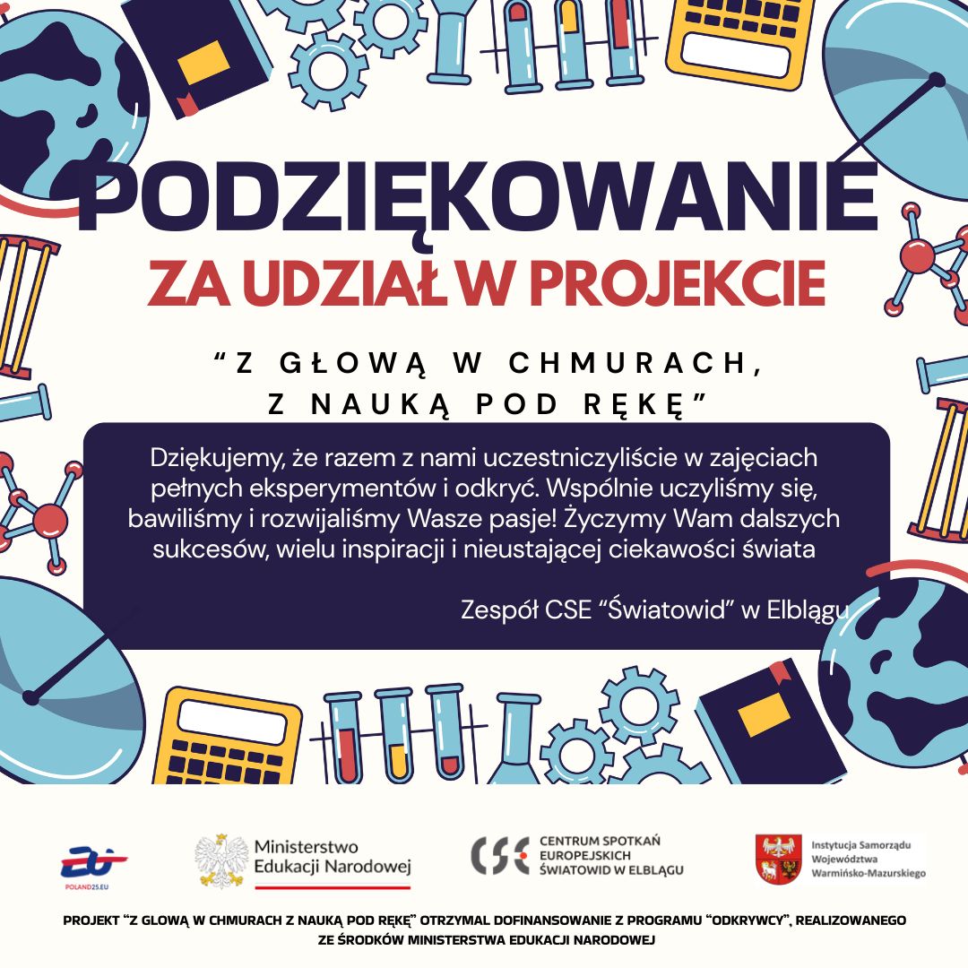 Centrum Spotkań Europejskich „Światowid” w Elblągu realizuje projekt „Z głową w chmurach, z nauką pod rękę”dofinansowany w ramach programu „Odkrywcy” z Ministerstwa Edukacji Narodowej.