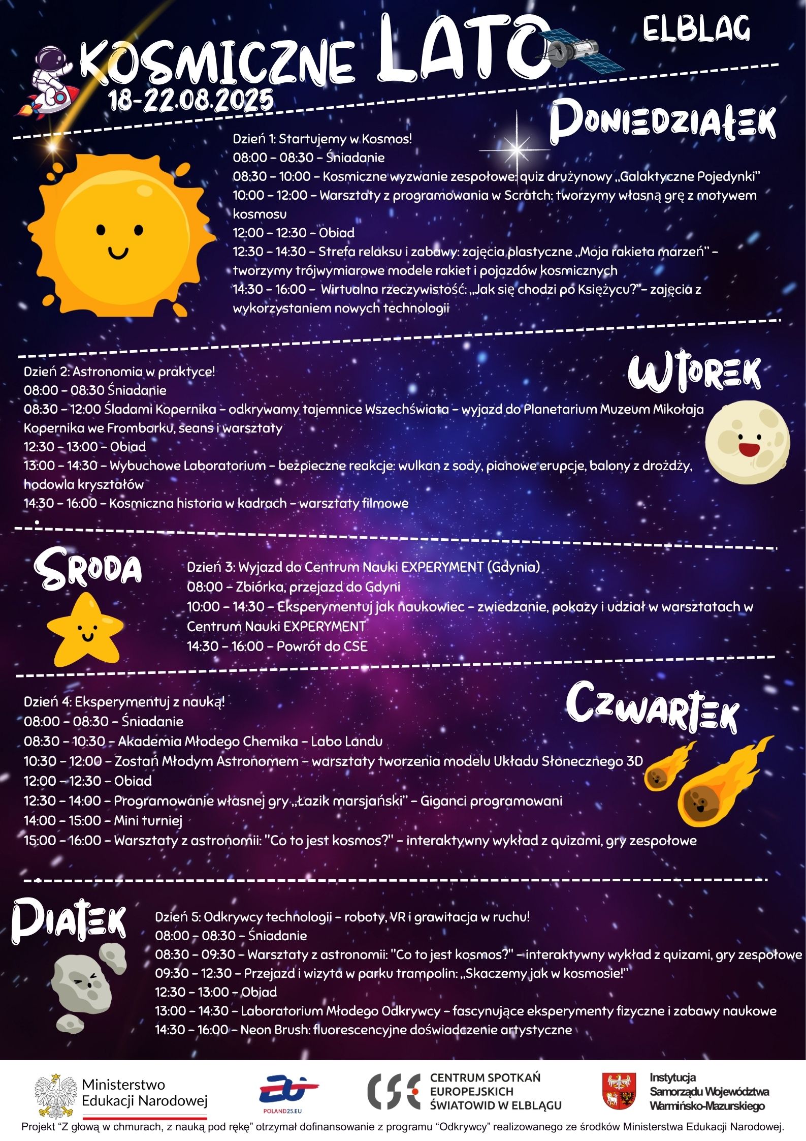 W sierpniu 2025 roku w Centrum Spotkań Europejskich „Światowid” w Elblągu odbyły się półkolonie edukacyjne „Kosmiczne Lato”, realizowane w ramach projektu „Z głową w chmurach, z nauką pod rękę”. W zajęciach uczestniczyły cztery 20-osobowe grupy dzieci w wieku 7–13 lat – po jednej z każdej miejscowości objętej projektem.