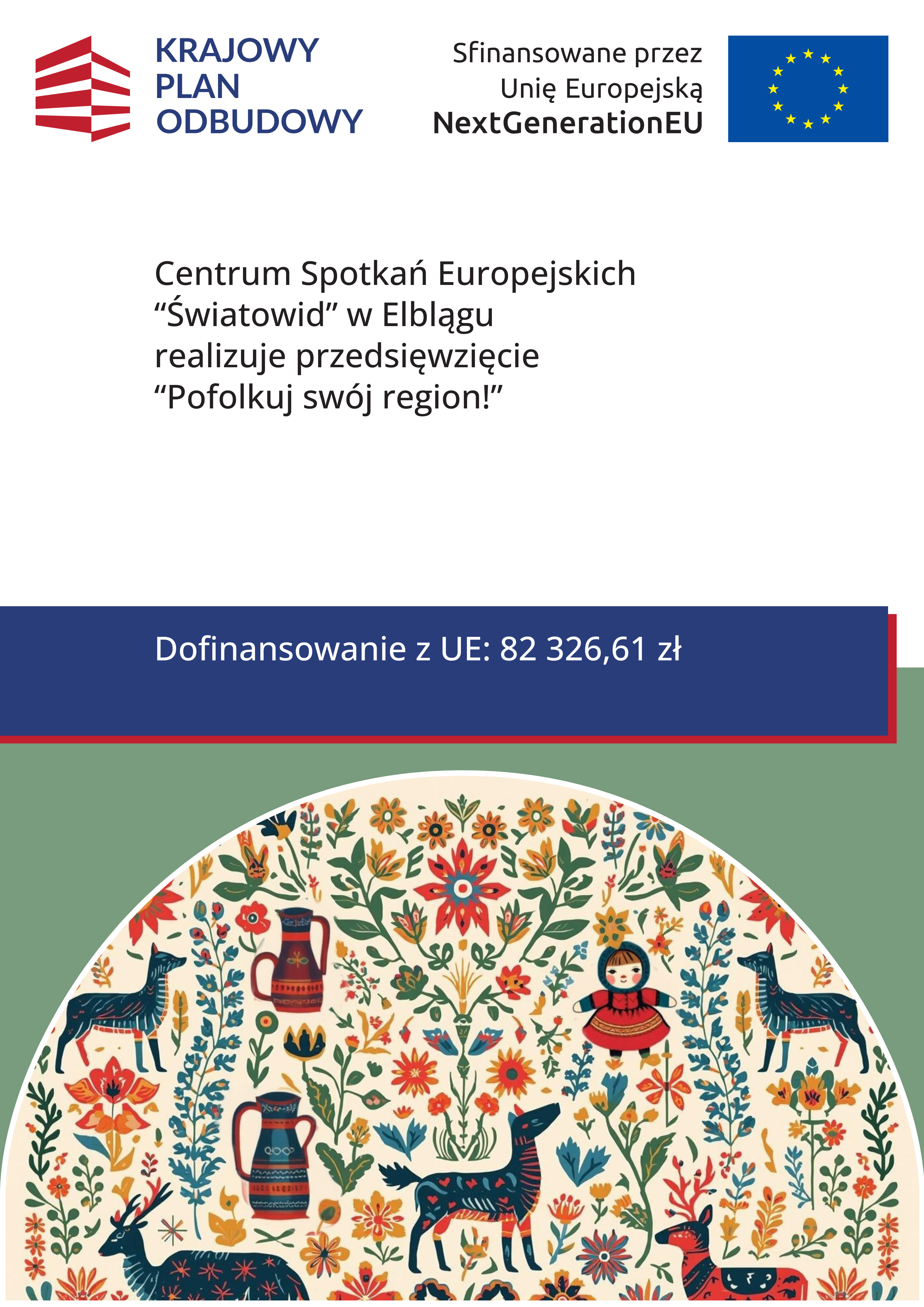 Celem projektu jest twórcze ożywienie i upowszechnienie dziedzictwa kulturowego Warmii, Mazur, Powiśla, Żuław i Ziemi Lubawskiej w nowoczesnej formie przy zaangażowaniu społeczności w jego współczesną interpretację. Mieszkańcy pięciu małych miejscowości odkryją i stworzą unikalne skarby swoich regionów (obiekty materialne i cyfrowe inspirowane tradycjami i sztuką ludową), które trafią do Folk Kapsuł - innowacyjnych mobilnych zestawów edukacyjnych. Efekty zostaną udostępnione online oraz zaprezentowane podczas finałowego wydarzenia - Festiwalu FolkON!, w ramach którego odbędzie się m.in. konferencja, warsztaty edukacyjne i rękodzielnicze, wystawy multimedialne, pokazy artystyczne oraz Szarady ludowe inspirowane kulturą ludową.