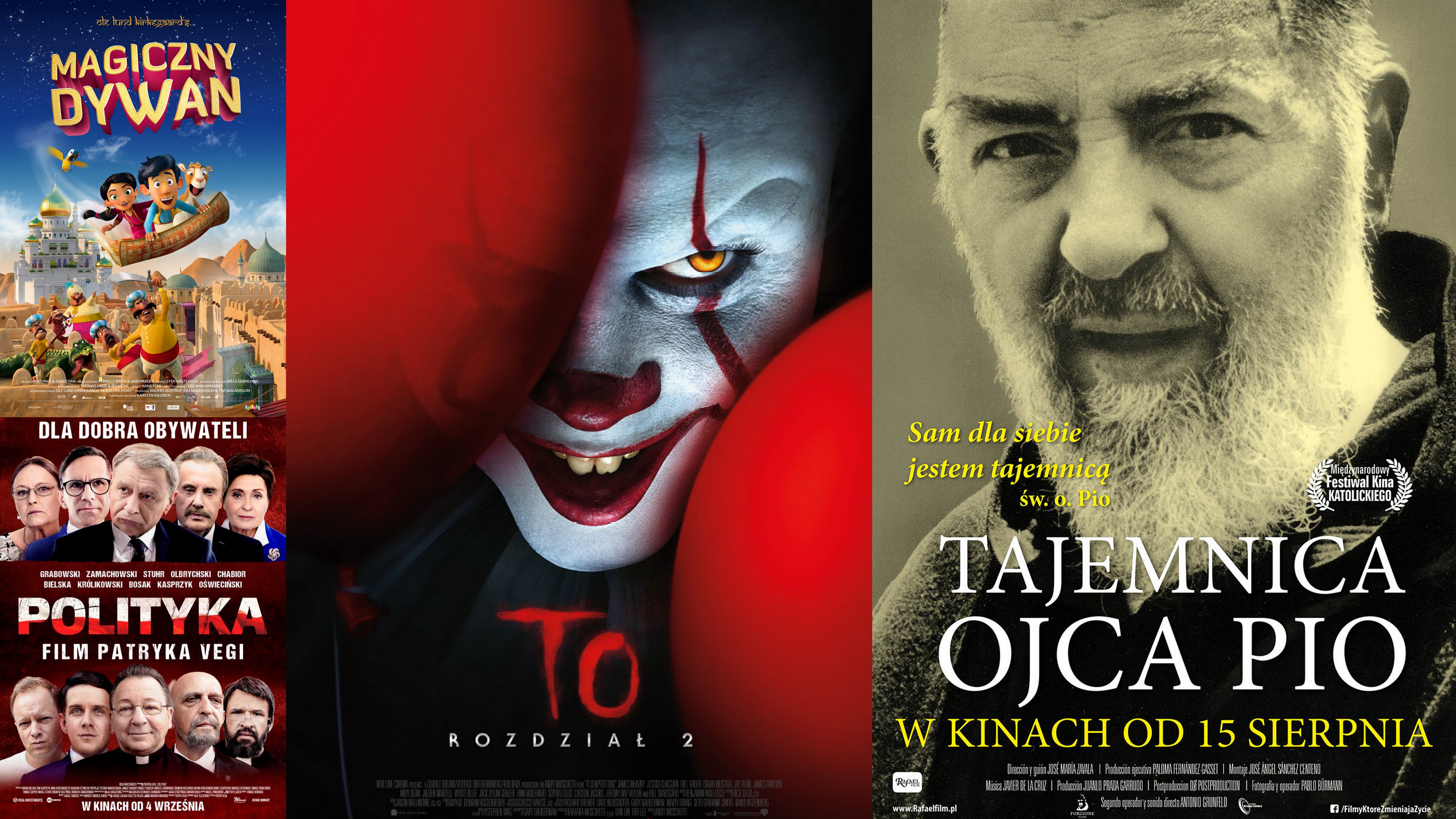 Reżyseria: Andres MuschiettiObsada: Bill Skarsgård, James McAvoy, Jessica Chastain, Bill Hader, Isaiah Mustafa, Jay Ryan, James Ransone, Andy BeanProdukcja: USA 2019Czas: 169 min.Najnowszy film VegiOd 4 do 26 września Kino Światowid zaprasza na produkcję Patryka Vegi "Polityka". To film, który z właściwą reżyserowi ostrością portretuje środowisko wzbudzające w kraju powszechne i skrajne emocje. Które dzieli Polaków jak żadne inne. I które nigdy dotąd nie zostało równie przenikliwie pokazane na dużym ekranie.W „Pitbullu” Patryk Vega zajął się policją, w „Botoksie” wziął pod lupę służbę zdrowia, a teraz przyszedł czas na polską scenę polityczną. Co robią i jak zachowują się najważniejsi ludzie w kraju, kiedy gasną światła kamer i spadają maski? Jak władza i dostęp do publicznych pieniędzy wpływa na osoby piastujące najwyższe urzędy i pełniące obowiązki wobec Narodu? Bezkompromisowa „Polityka” odpowiada na te pytania. To film o przedstawicielach wszystkich frakcji i ugrupowań politycznych w Polsce, o rządzących i opozycji, o świeckich liderach i politykach w sutannach.Reżyseria: Patryk VegaObsada: Andrzej Grabowski, Zbigniew Zamachowski, Maciej Stuhr, Daniel Olbrychski, Tomasz Oświeciński, Iwona Bielska, Janusz Chabior, Antoni Królikowski, Marcin Bosak, Ewa KasprzykProdukcja: Polska 2019Czas: 135 min.
