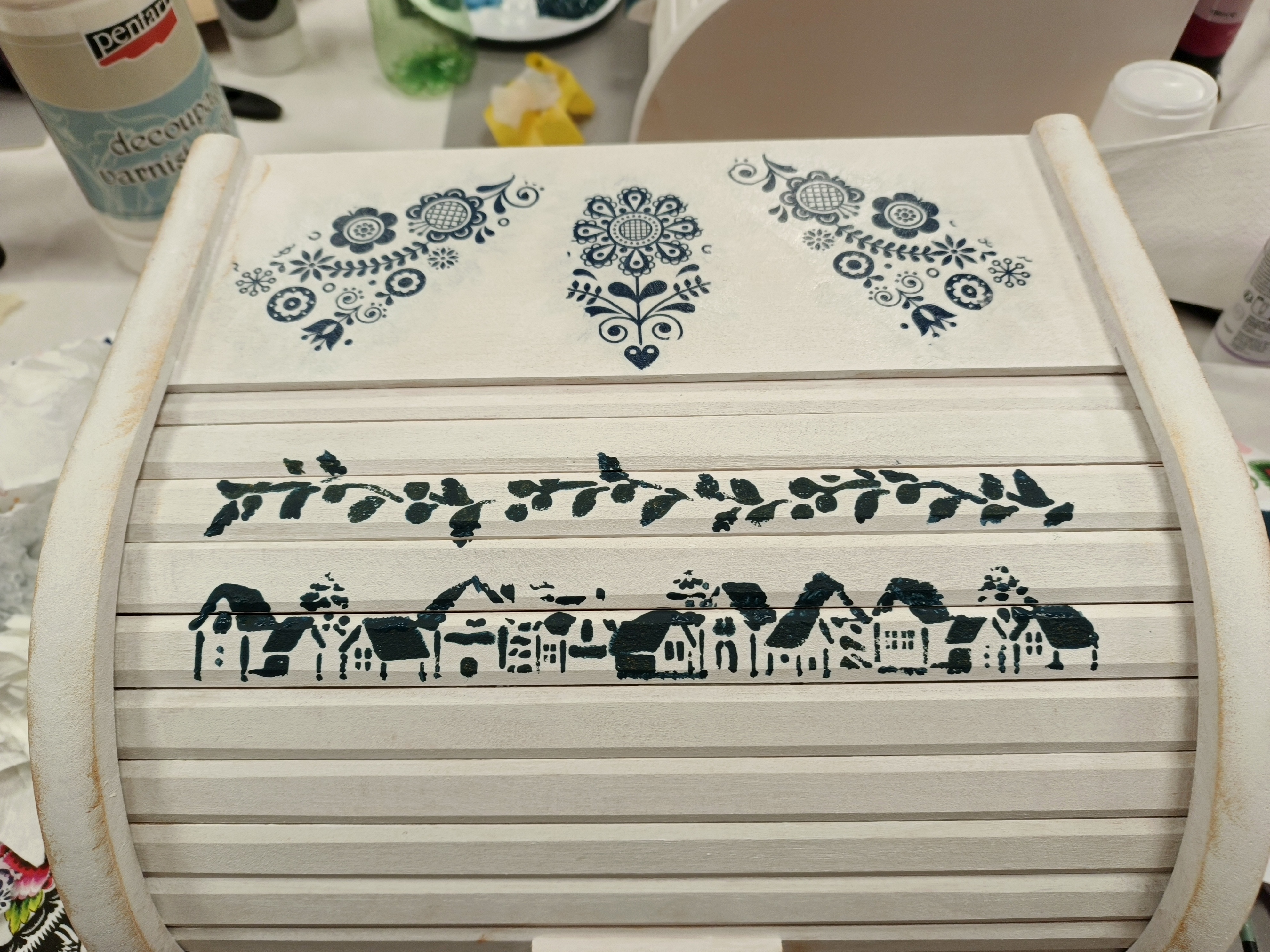 Warsztaty rękodzielnicze były równie intensywne i barwne – choć tym razem dosłownie pracowano ze sztywnym drewnem. Uczestnicy zdobili drewniane chlebaki motywami inspirowanymi regionem, tworzyli deski do serwowania potraw z wzorami haftu powiślańskiego, a także wykonywali obrazy z gwoździ i sznurka, łączące prostą formę z efektownym rezultatem wizualnym. Zajęcia miały charakter międzypokoleniowy, co dodatkowo wzbogaciło wspólną pracę – doświadczenie spotykało się tu z młodzieńczą wyobraźnią, a tradycja z nowoczesnym spojrzeniem.