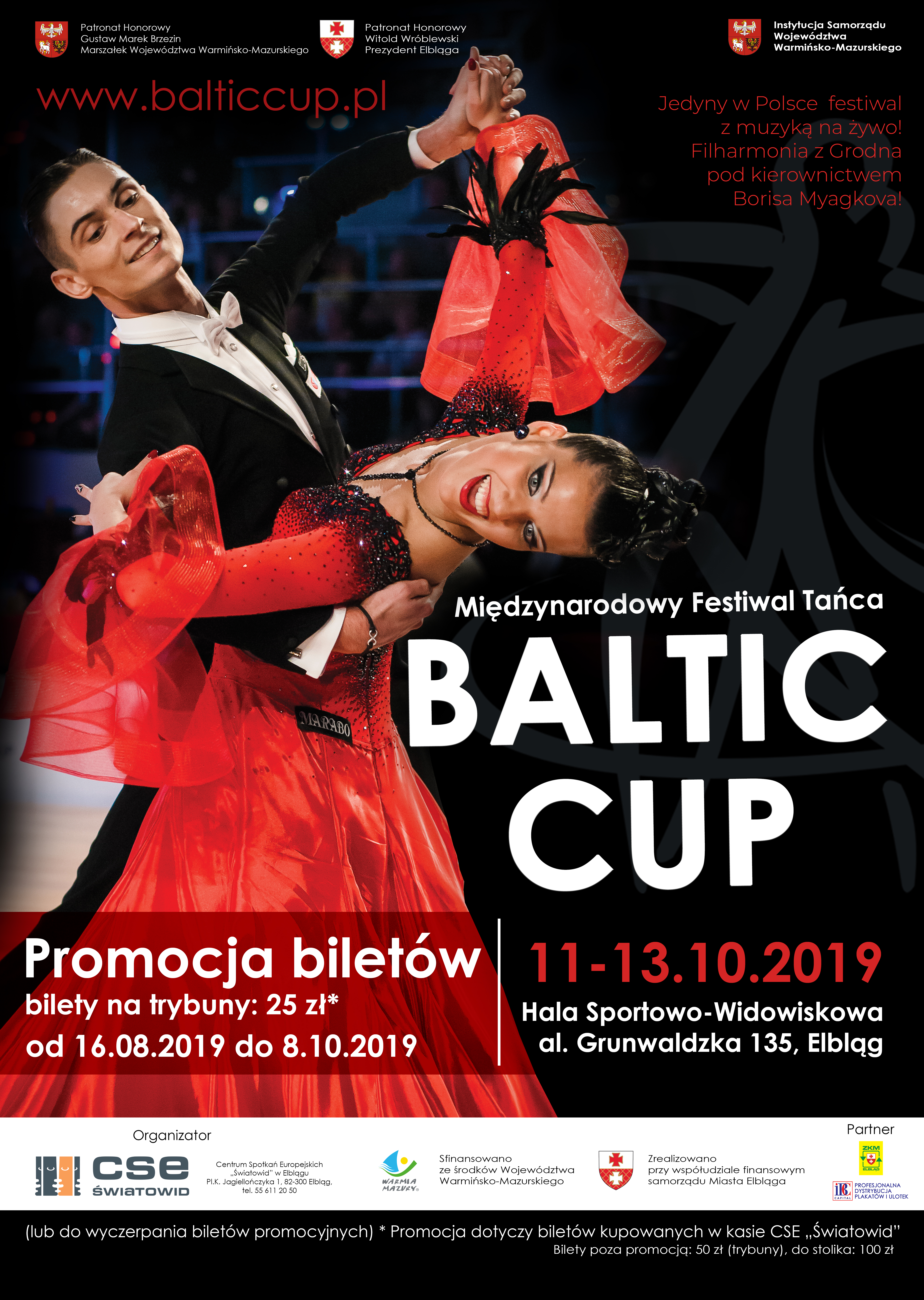 Dlatego zachęcamy do zakupu biletów w przedsprzedaży na Międzynarodowy Festiwal Tańca „Baltic Cup”. Sprzedaż już trwa. Do 8 października włącznie lub wyczerpania ilości promocyjnych wejściówek - przygotowaliśmy ich 500 sztuk - bilety kosztują 25 zł od osoby. Promocja dotyczy tylko biletów kupowanych w kasie CSE „Światowid” na miejscu. Bilety można kupić w kasie Kina Światowid przy placu Jagiellończyka lub zarezerwować i kupić on-line na stronie internetowej www.swiatowid.elblag.pl. Bilety dostępne będą także podczas trwania Festiwalu w kasie hali sportowo-widowiskowej MOSIR przy Al. Grunwaldzkiej.