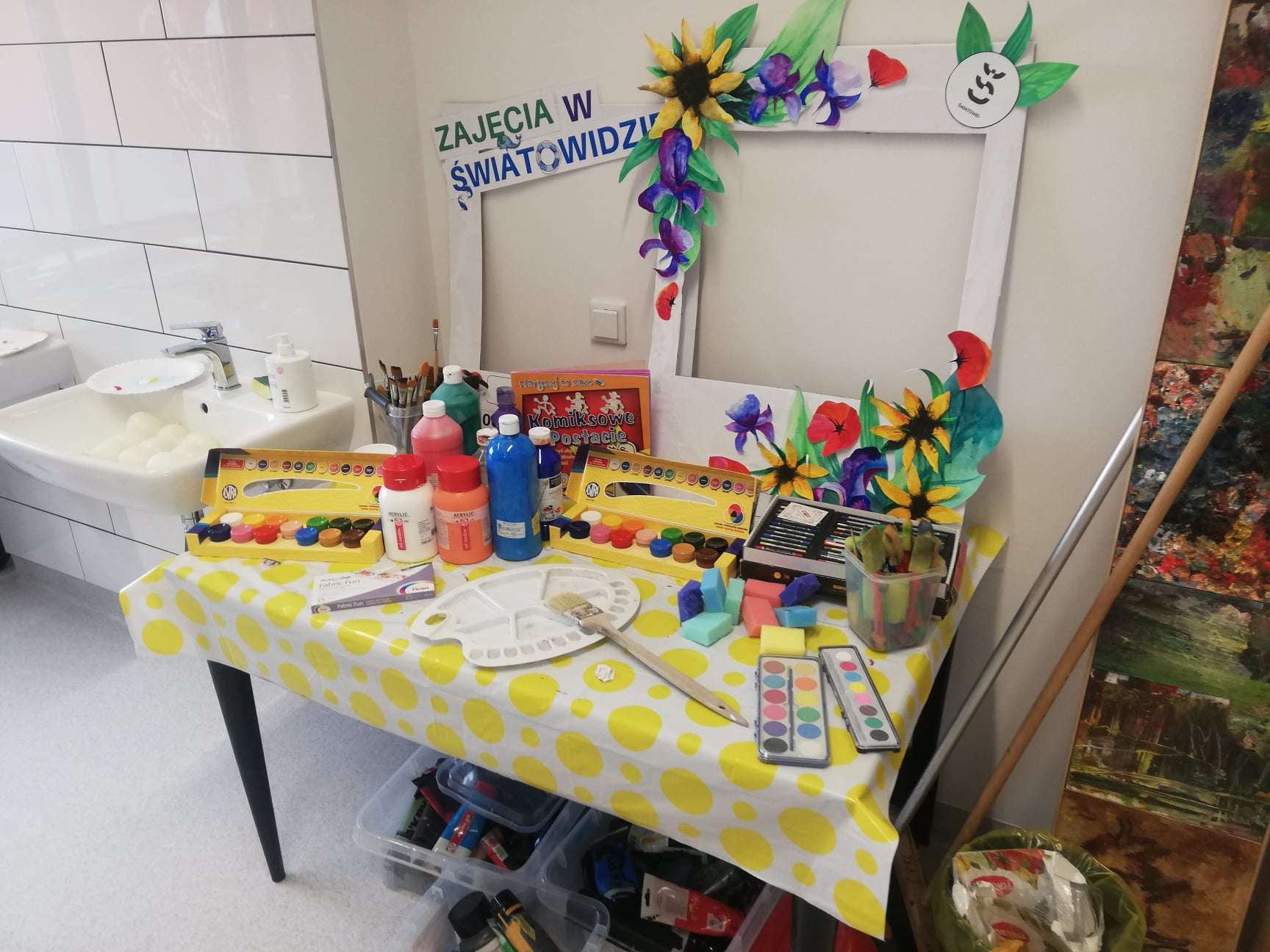 Jesteśmy w pracowni malarskiej. Dzieci poznają różne techniki malarskie, uczą się kreatywności i przy tym wszystkim świetnie się bawią.