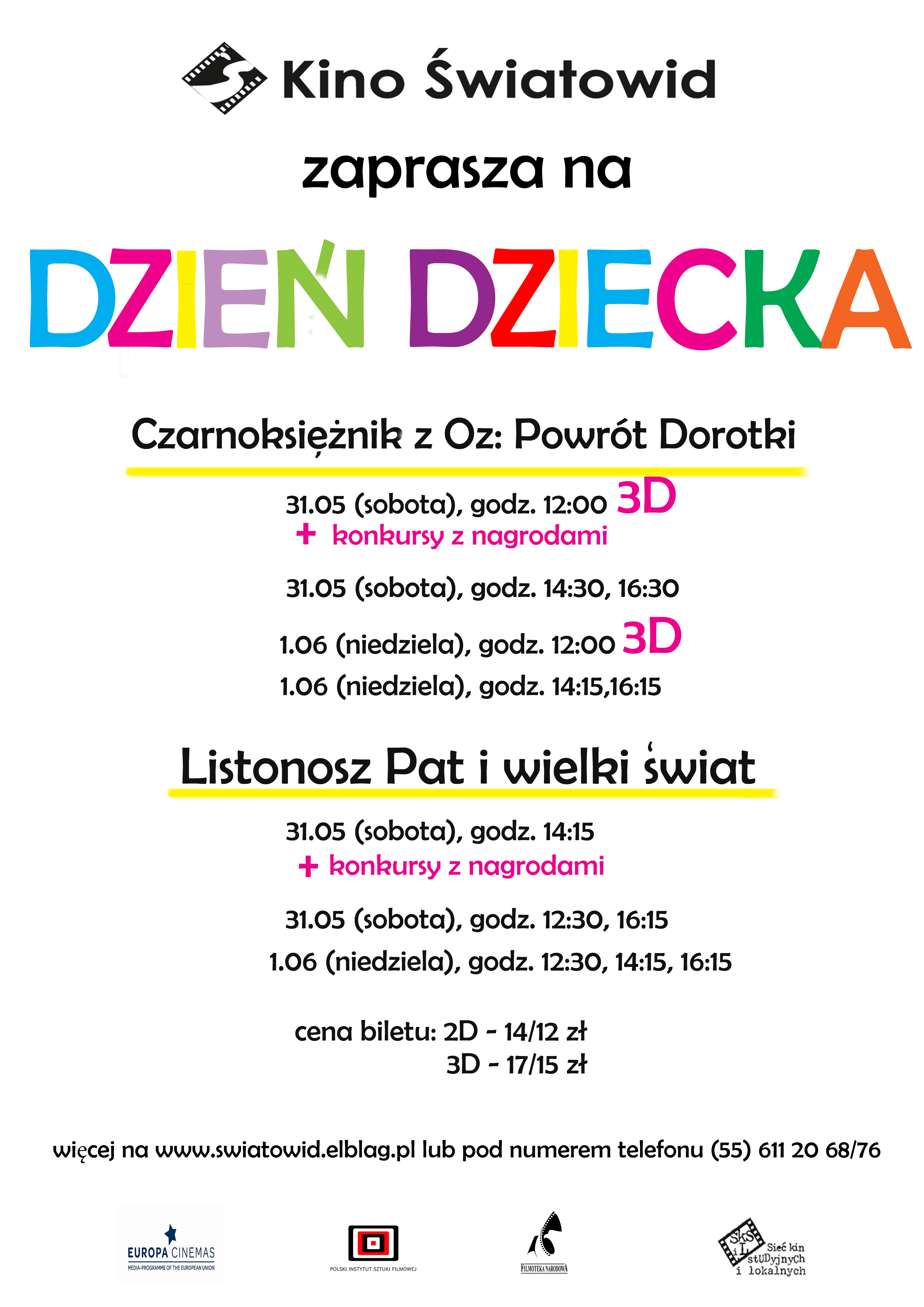 Kino Światowid z okazji Dnia Dziecka przygotowało aż dwie propozycje filmowe. Dzieci będą mogły przenieść się w magiczną podróż po krainie Dorotki i Czarnoksiężnika z Oz lub wczuć się w przygody Listonosza Pata. Dodatkową atrakcją wybranych seansów będą konkursy z nagrodami.